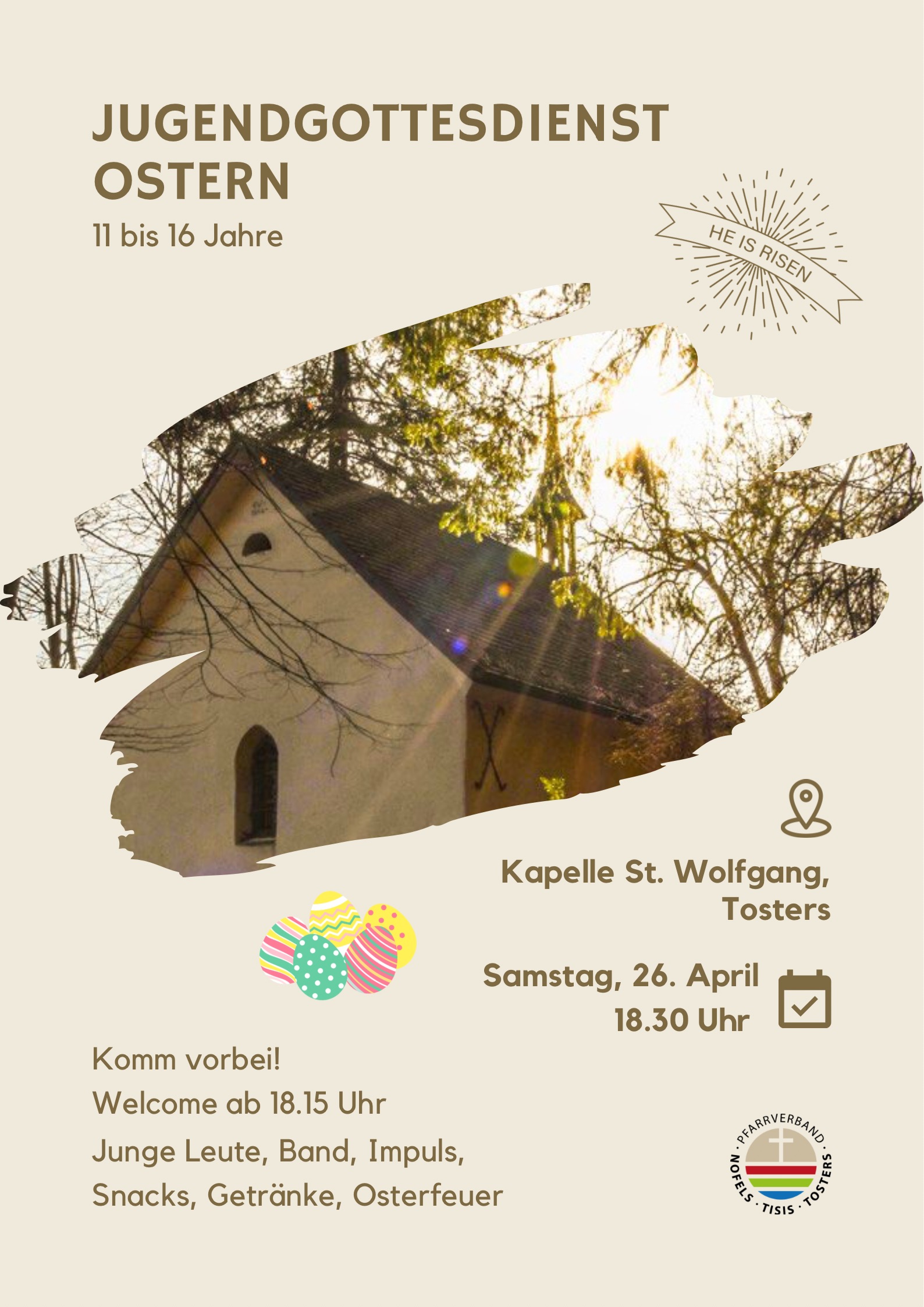 Wir feiern Ostern! Am Samstag, 26.4., auch als Jugendgottesdienst. Herzliche Einladung an alle 11-16-Jährige in die Wolfgangskapelle!