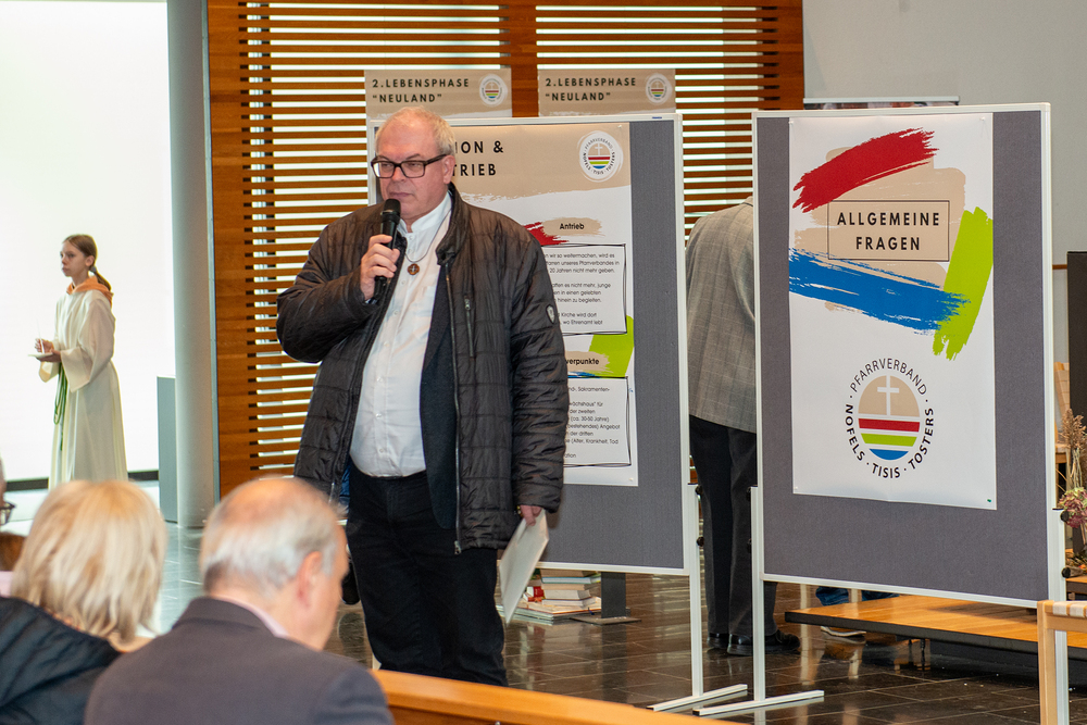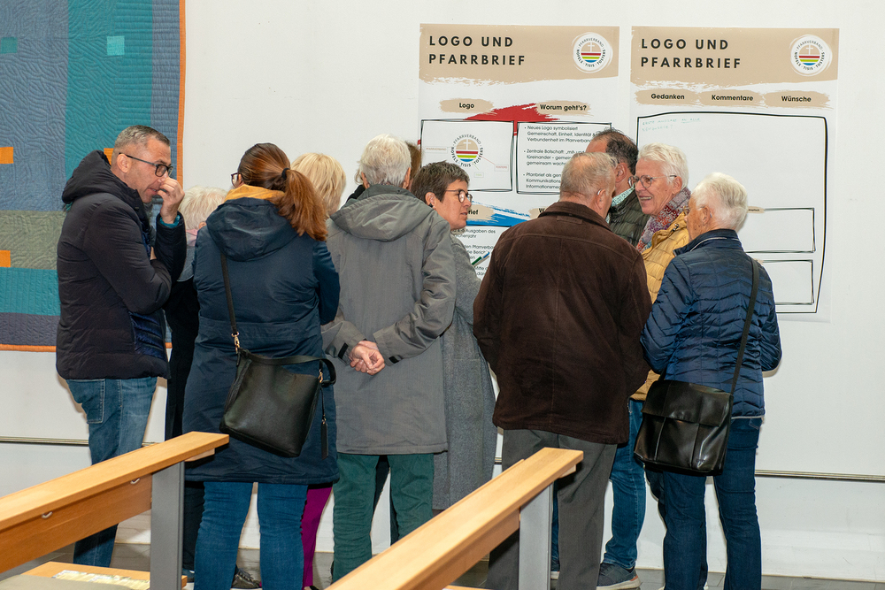 Im Anschluss daran nahmen wir uns Zeit, vom laufenden Pfarrverbands-Prozess zu erzählen und mit den Gemeindemitgliedern in den Austausch zu gehen. Dafür wurden mehrere Stationen mit Informationsplakaten hergerichtet, an denen man sich zu den einzelnen Themen und Arbeitsgruppen informieren konnte. Außerdem gab es die Möglichkeit, bei den jeweiligen Stationen seine eigenen Gedanken und Anregungen miteinzubringen. Die aktive Beteiligung an dieser Zeit des Austausches war erfreulich hoch und es benötigte aufgrund des regen Interesses mehrere Anläufe in der Moderation diesen Programmpunkt der Versammlung zu beenden.